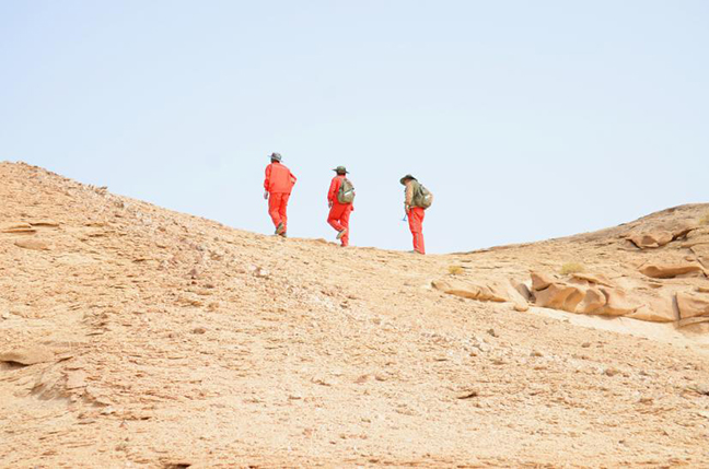 新疆鑫匯公司的野馬泉西金礦項目工作區(qū)距離哈密市155公里,工期為6-10月,需完成6千米的鉆探工作任務、16平方公里的地質(zhì)剖面等。礦區(qū)內(nèi)山丘連綿不絕,自7月開始,每天下午礦區(qū)地面溫度均超過普通溫度計的最高刻度,屬于“爆表”狀態(tài)。因工作任務緊,地質(zhì)隊員們每天早上7點出發(fā),中午之前要返回基地,傍晚重新出發(fā),22點前趕回基地,開展剖面測量和鉆探編錄工作,以避開正午的酷熱。為了不被灼傷,地質(zhì)隊員和鉆探工人把自己包裹得嚴嚴實實,手拎地質(zhì)錘敲下每一個礦化線索,身背樣品包裝載好沉甸甸的希望。汗水浸濕衣衫,腳底磨出老繭,他們踏遍了礦區(qū)的角角落落,最終繪制出整個礦區(qū)的礦化藍圖。