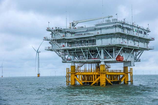 國能大豐H5#海上風電場項目由32臺GW184-6.45MW智能海上風電機組構(gòu)成,坐落于大豐港水域港界之外,太平沙北側(cè),輻射沙洲北端,其場區(qū)中心距離海岸約67公里。