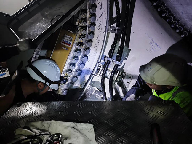面對(duì)復(fù)雜海況,運(yùn)維團(tuán)隊(duì)同步完成多項(xiàng)關(guān)鍵作業(yè):對(duì)#01、#04風(fēng)機(jī)蓄能器支架實(shí)施技改以提升設(shè)備穩(wěn)定性;快速處理#19風(fēng)機(jī)偏航液壓站缺陷以恢復(fù)風(fēng)機(jī)運(yùn)行;在顛簸的船上和高空機(jī)艙內(nèi),團(tuán)隊(duì)將“精益運(yùn)維”落實(shí)到每個(gè)細(xì)節(jié)。