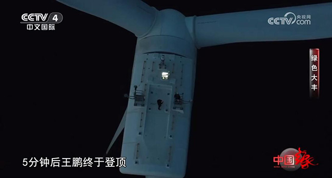 傍晚,風(fēng)電場(chǎng)的運(yùn)維人員王鵬要對(duì)15號(hào)風(fēng)機(jī)進(jìn)行檢修,馬諾打算一同前往。這座風(fēng)機(jī)出水高度約120米,相當(dāng)于40層樓高,為了保證上機(jī)人員的安全,他們必須要穿戴好特制的防護(hù)裝置。要想進(jìn)入風(fēng)機(jī)內(nèi)艙,馬諾和王鵬要先爬到風(fēng)機(jī)外部10米高的平臺(tái)上,由于上風(fēng)機(jī)的難度很大,程序繁瑣,王鵬每次都會(huì)提前準(zhǔn)備好所有的物資,用繩子吊上去。